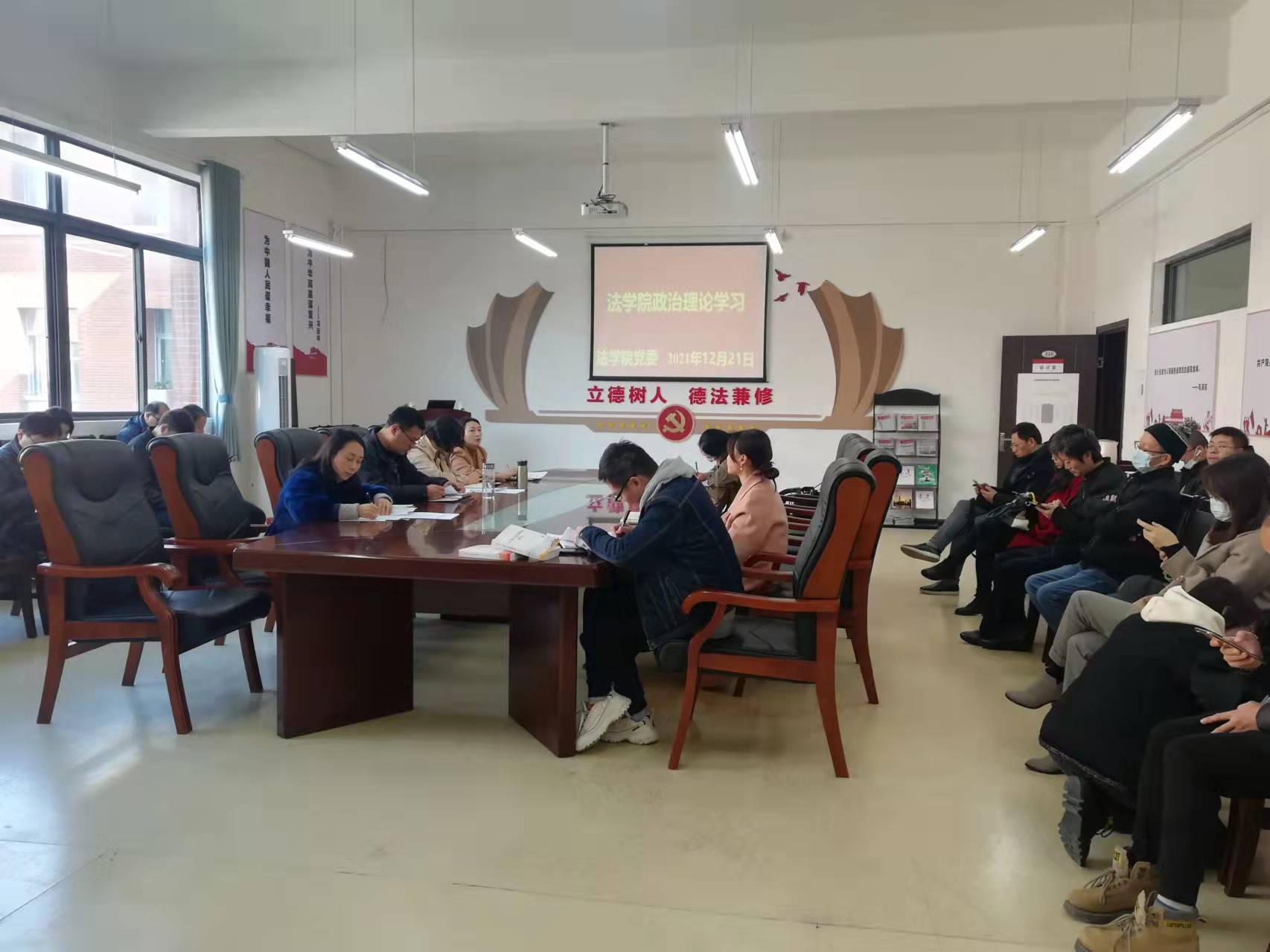 (法学院 图文/报道 母桂花)2021年12月21日,法学院党委在文德楼A8-310会议室围绕“中国共产党第十九届中央委员会第六次全体会议和中国共产党贵州省第十二届委员会第十次全体会议精神”专题,组织召开2021年度第十八次教职工政治理论集体学习研讨会议。院领导及全院教职工出席会议,院党委书记詹伟主持会议。