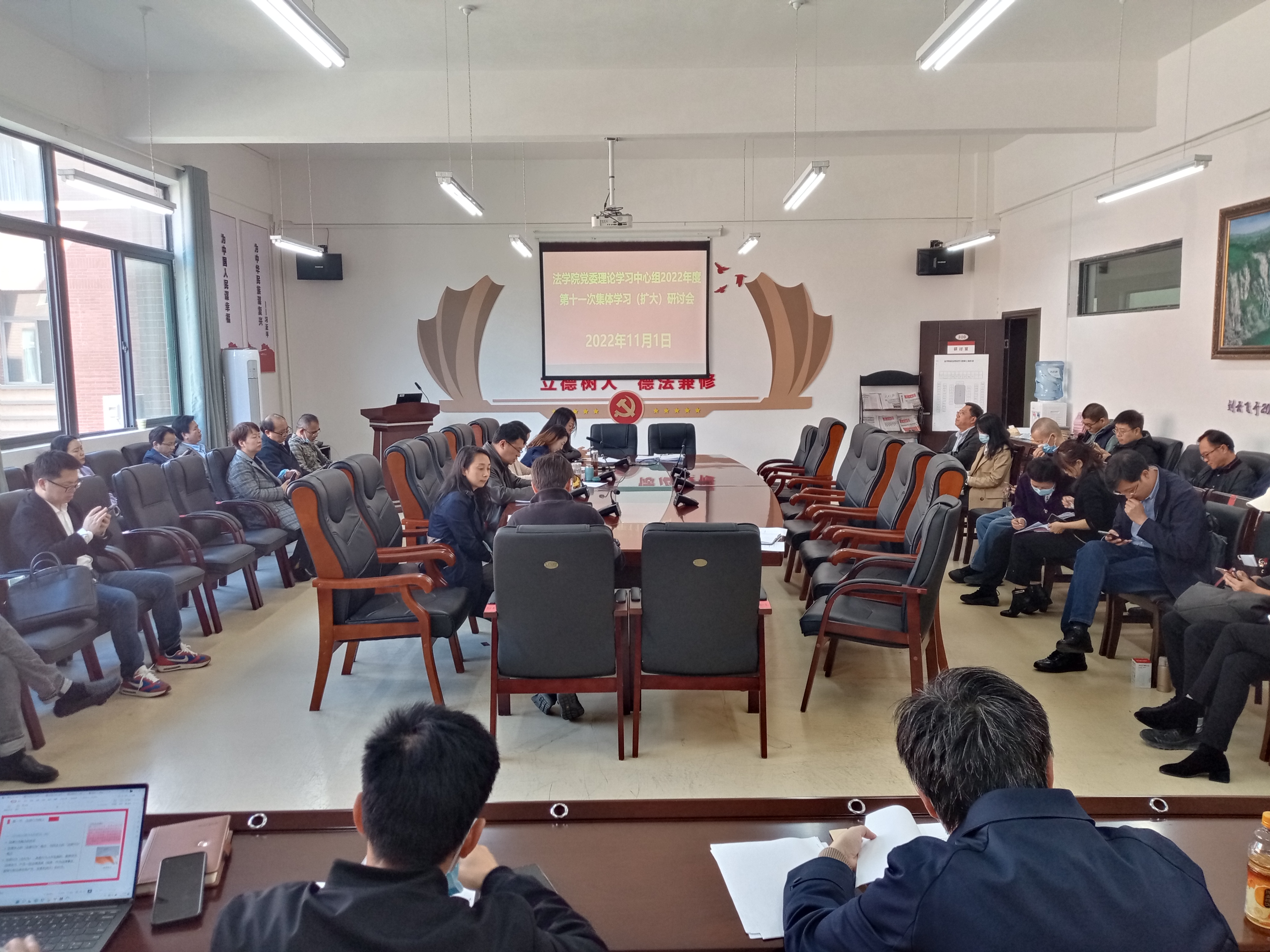 2022年11月1日上午,法学院党委理论学习中心组围绕“党的二十大精神”专题集中学习研讨。学院领导及全体行政人员、支部书记参加会议,学院党委书记詹伟主持会议。