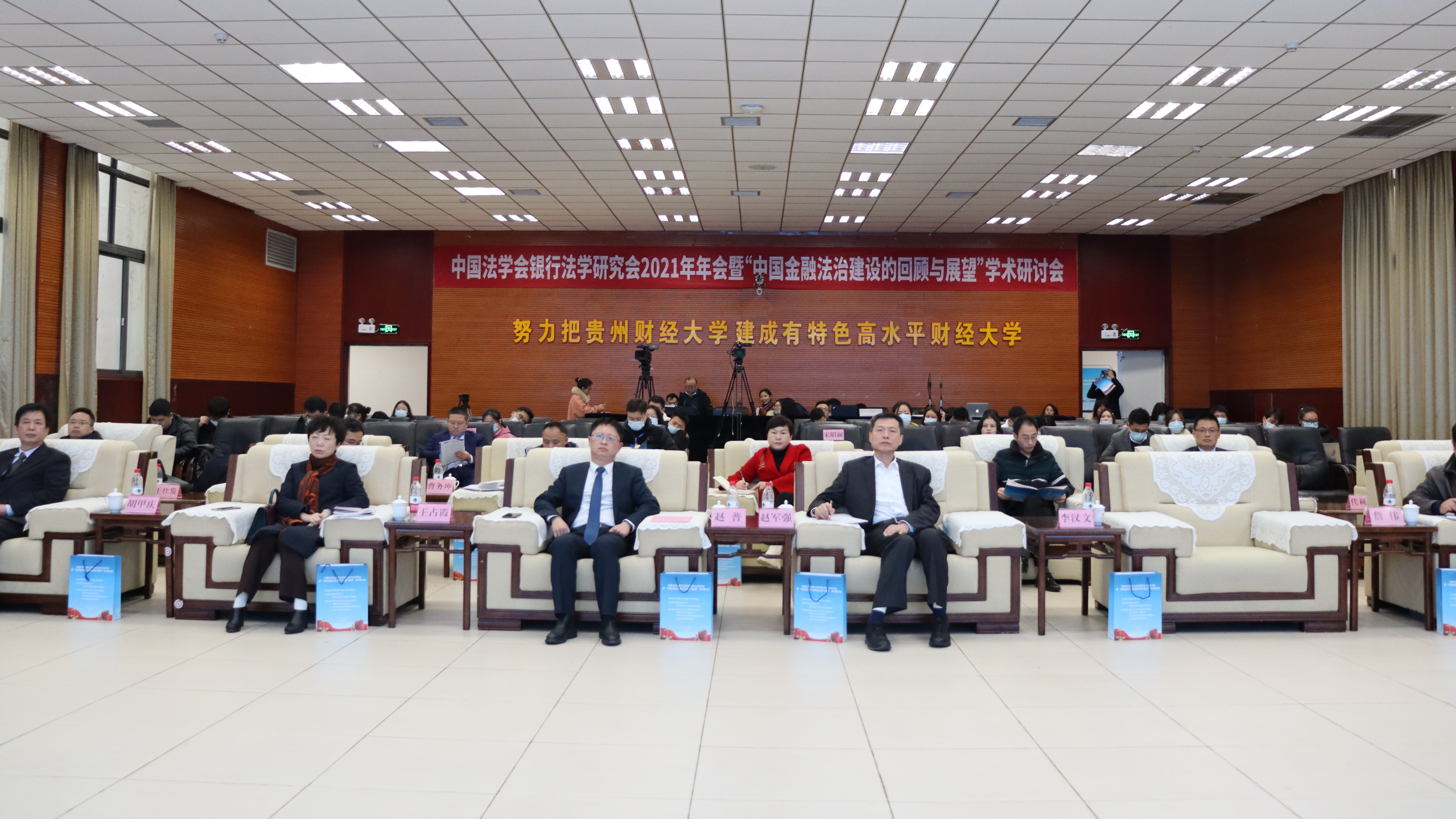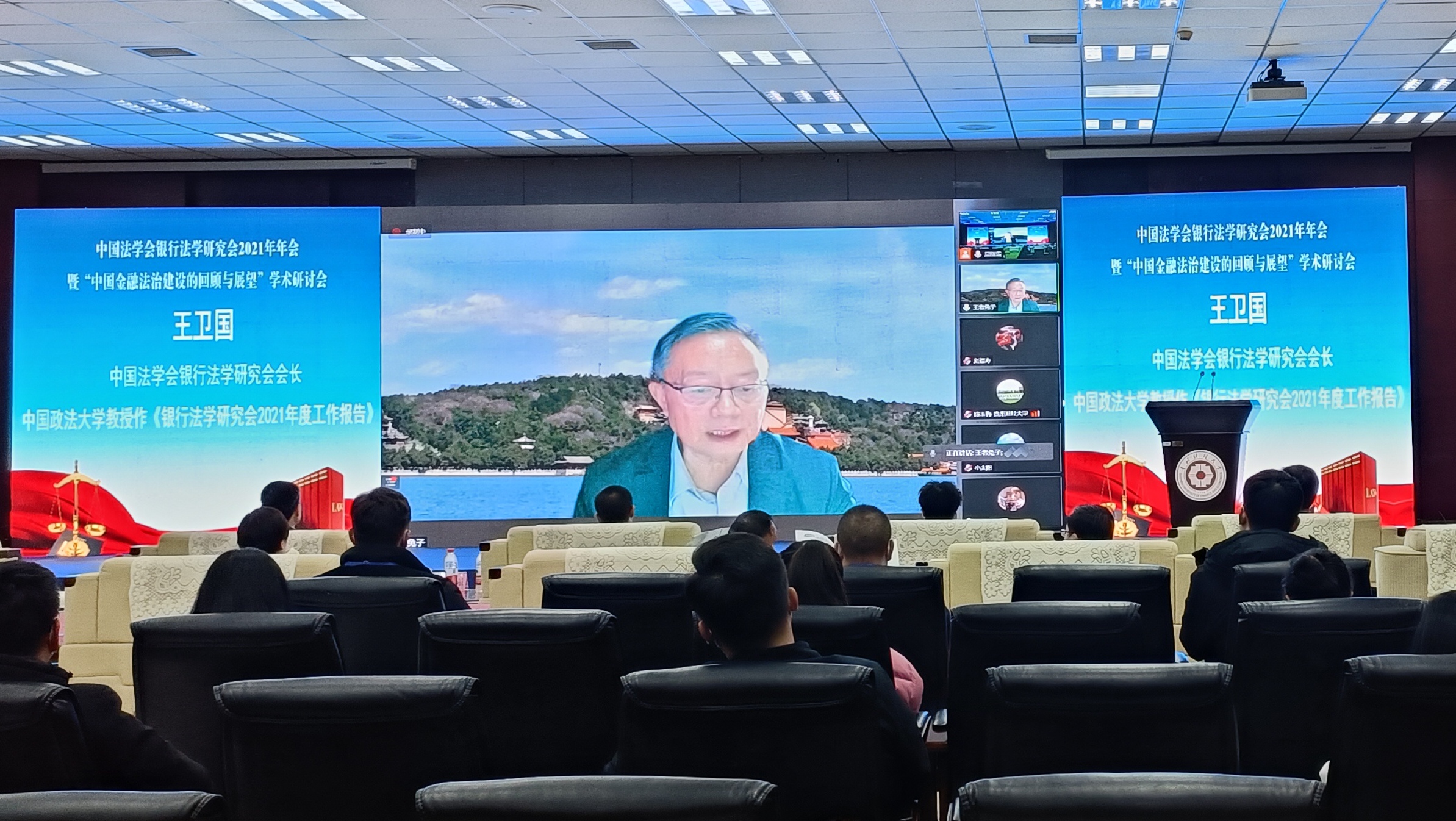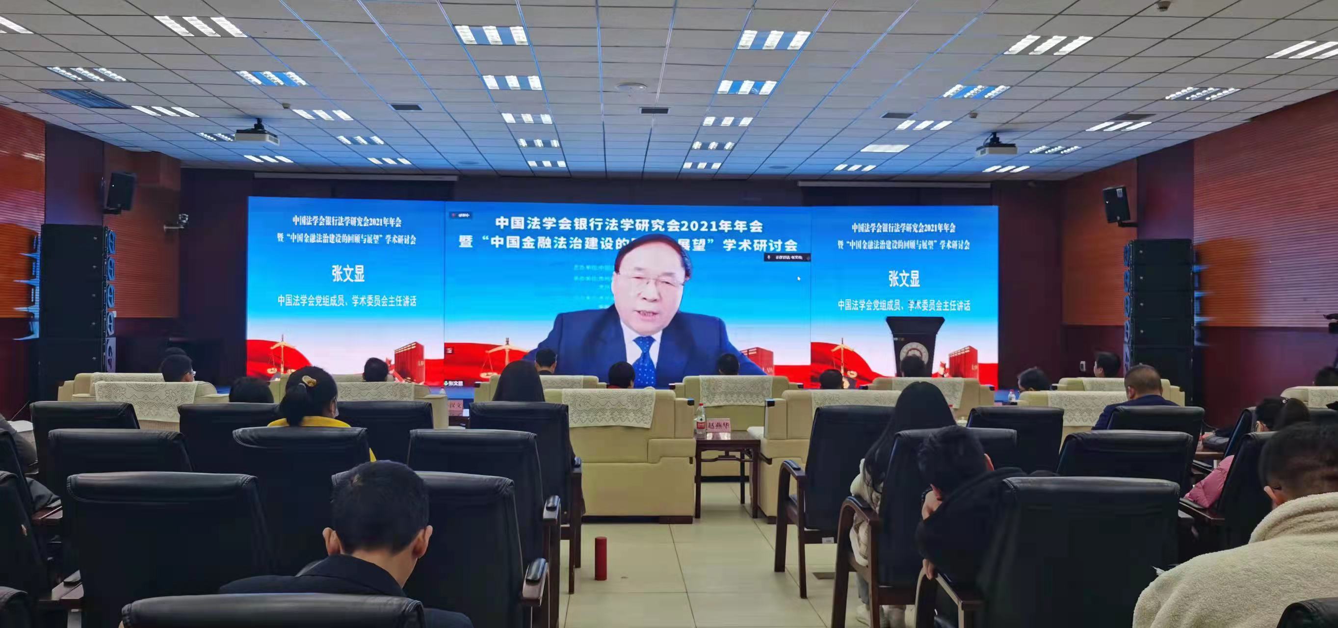 (法学院 唐沁馨 报道|摄影 米钰)2021年12月11日,法学院承办的中国法学会银行法学研究会2021年年会暨“中国金融法治建设的回顾与展望”学术研讨会在华体会体育(中国)hth·官方网站花溪校区成功举行。本次年会由中国法学会银行法学研究会主办,华体会体育(中国)hth·官方网站和贵州省法学会金融法学研究会联合承办。贵州财经大学党委副书记、校长赵普教授,中国法学会党组成员、学术委员会主任张文显教授,中国法学会银行法学研究会会长、中国政法大学王卫国教授,中国法学会银行法学研究会名誉会长、原中国建设银行副行长黄毅,中国法学会银行法学研究会常务副会长、中国银保监会首席风险官刘福寿,贵州省法学会专职副会长兼秘书长王占霞,中国光大银行贵阳分行行长赵军强出席了本次年会,来自全国27家高校、银行及律师事务所的专家学者1500人参加了线上会议。会议由贵州财经大学党委委员、副校长李汉文教授主持。