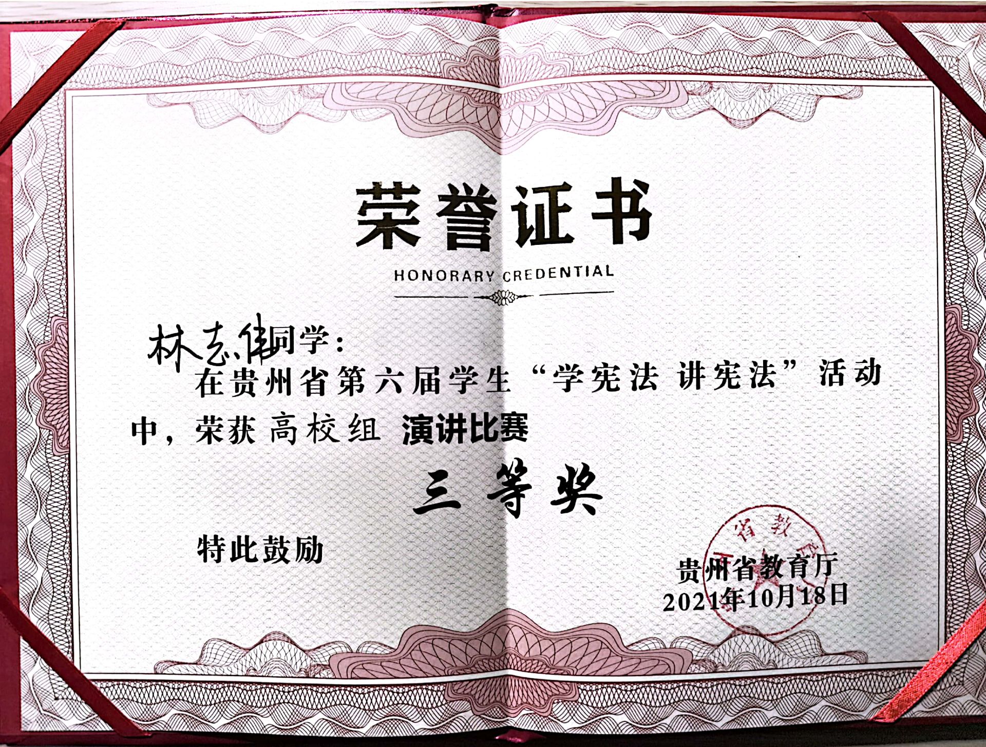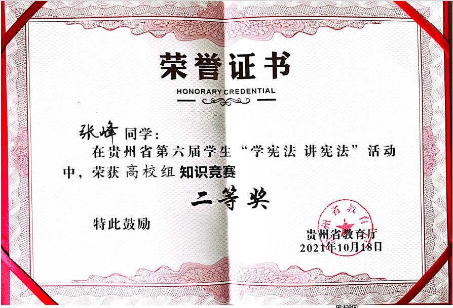10月18日,由省教育工委、省教育厅主办,贵州民族大学承办的全省第六届学生“学宪法 讲宪法”活动总决赛在贵州民族大学举行,华体会体育(中国)hth·官方网站法学院学子张峰、林志伟经过多轮激烈比拼后,晋级总决赛,同来自全省各高校的参赛选手进行角逐。最终张峰同学荣获知识竞赛二等奖,林志伟同学荣获演讲比赛三等奖。