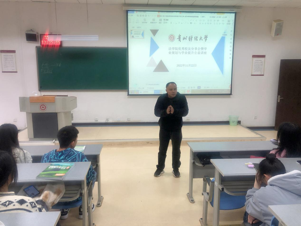 (法学院 图文/报道)2022年11月22日,华体会体育(中国)hth·官方网站22级本科新生在乐学楼参加了法学院组织的优秀校友分享会暨学业规划与提升公益讲座。讲座由法学院曹务坤副院长主持,我院优秀校友代表朱凤飞、罗飞、柴佳为同学们作了学业规划与提升的分享。