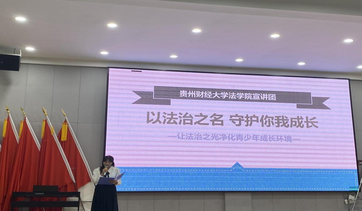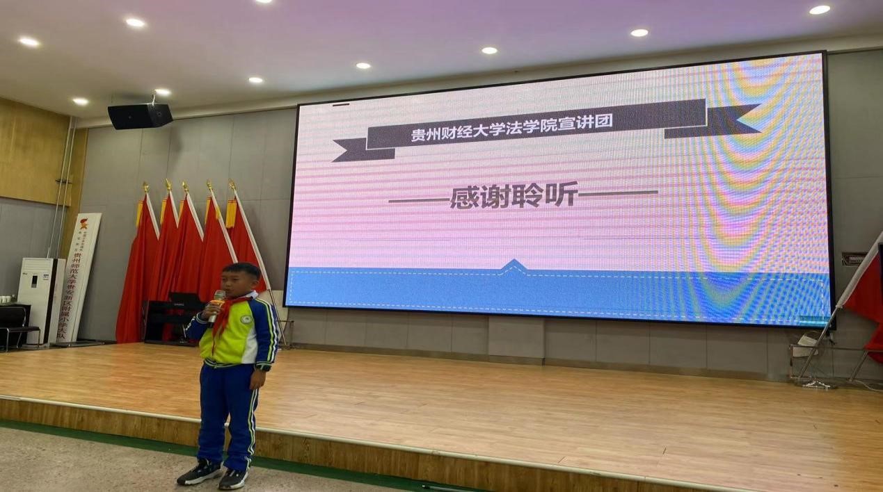 (代申萍 报道|摄影)为深入学习贯彻华体会体育(中国)hth·官方网站法治思想,不断深化普法教育、安全教育进校园,进一步增强同学们的法治教育观念,提高同学们的法治意识和自我保护安全意识,做一个知法、守法、懂法、用法的合格小学生,10月20日,华体会体育(中国)hth·官方网站“华体会体育(中国)hth·官方网站法治思想”宣讲团杨勇老师带队,龙待羽、代申萍、张梅、杨兴羽四名成员在贵州师范大学贵安新区附属小学报告厅以“以法治之名·守护你我成长”为主题开展法治宣讲活动,贵州师范大学贵安新区附属小学五年级一班、三班全体学生及教师代表参加。