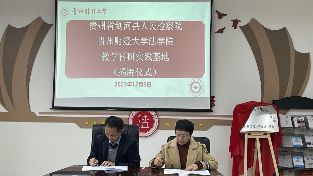 (法学院 申思圆 图文报道)为更好落实协同育人的人才培养目标,合力推动检察实务与法学教育育人工作更上一个台阶。12月5日,剑河县人民检察院与法学院举行“教学科研实践合作协议”签约暨“检察理论与实务研究基地”揭牌仪式。法学院党委书记詹伟,党委副书记、院长陈玉梅,剑河县人民检察院党组书记、检察长黄卡铁等参加签约和揭牌仪式。仪式由法学院党委委员、副院长宋昭澜主持。
