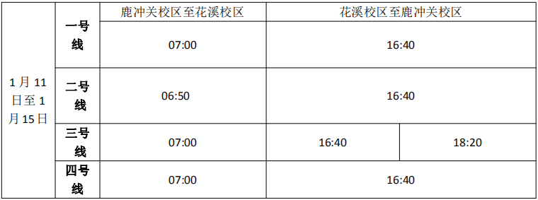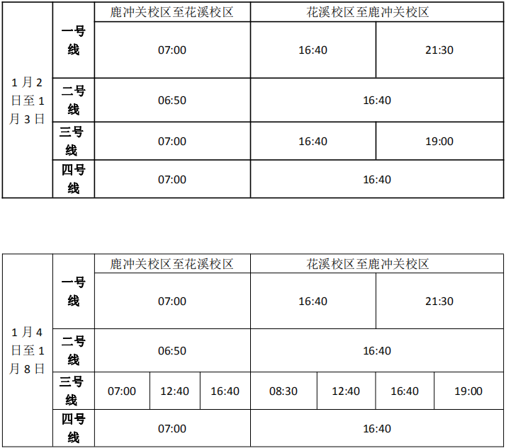 按照学校统一安排,华体会体育(中国)hth·官方网站鹿冲关校区、花溪校区进入期末考试阶段, 1月8日考试结束,为满足期末考试需要和行政科研工作的开展,现对交通车作如下调整: