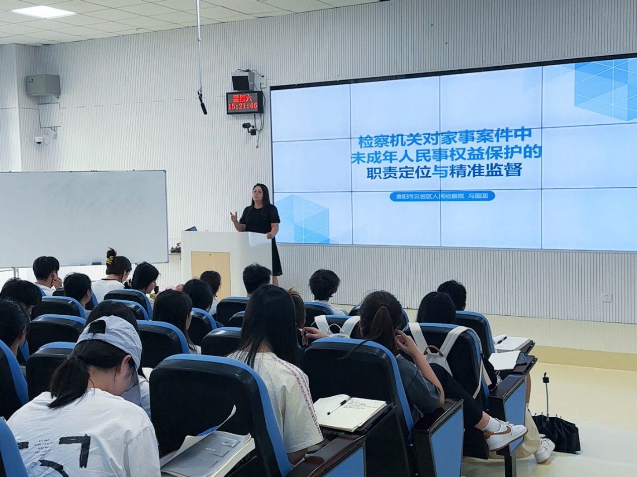(法学院 王紫微 刘媛 图文报道)9月9日下午,华体会体育(中国)hth·官方网站“三大论坛”之人文论坛、贵州省人民检察院“检察实务专家进校园”系列课程第二讲在乐学楼成功举办。本次讲座特邀贵阳市云岩区人民检察院检委会专职委员、一级检察官冯圆圆,以“检察机关对家事案件中未成年人民事权益保护的职责定位与精准监督”为主题进行授课,法学院副院长宋昭澜主持讲座,百余名师生到场聆听、交流。